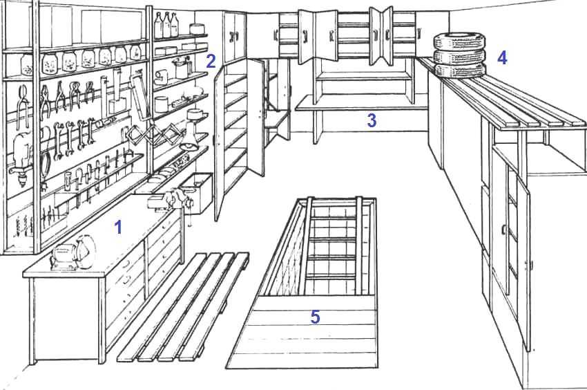 Пример размещения в гараже полезных приспособлений: 1 — верстак с ручными станками, 2 — стеллажи и шкафы, 3 — стол для проведения различных ремонтных работ, 4 — полка для хранения шин, 5 — смотровая яма