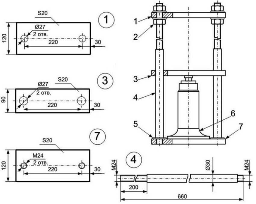 Схема изготовления гидравлического пресса: 1 — верхняя силовая платформа, 2 — гайки, 3 — нижняя платформа, 4 — шпильки диаметром 30 мм, 5 — нижняя резьба шпилек, 6 — гидравлический домкрат бутылочного типа; 7 — основание толщиной 20 мм