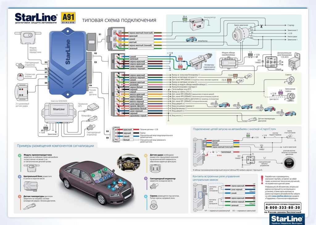 Такая же инструкция по спряжению, в паре со схемою подключения сигнализации Старлайн А91 с автозапуском, должна присутствовать в списке комплектующих элементов девайса.